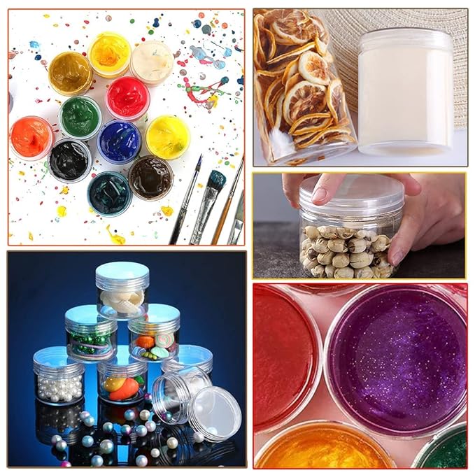 - 【Wide Application】-Our 2oz plastic containers with lids & 3/5/10 gram sample containers are perfect for beauty products, storing mineralized makeup, eye shadows, lotions, lip gloss, sugar body scrubs, creams, ointments, acrylic powder, body butter and other beauty aids. They are also suited to hold candy, teas, spices, cooking oils, herbs, medication, paints, small jewelry, and much more.