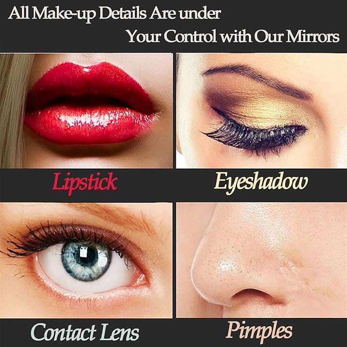 - 【Touch Screen Memory Function & 10X Magnification Modes】: Vanity mirror with smart design.The left M button is used to change the mode of the light, the middle button is used to turn on and off, and the right P button is used to adjust the brightness. Memory function can keep your light setting like you last use. Lighted makeup mirror has 10X panels magnifying and wide-angle viewing; see clearly your face and make a flawless makeup, suitable for desk makeup and handheld use.