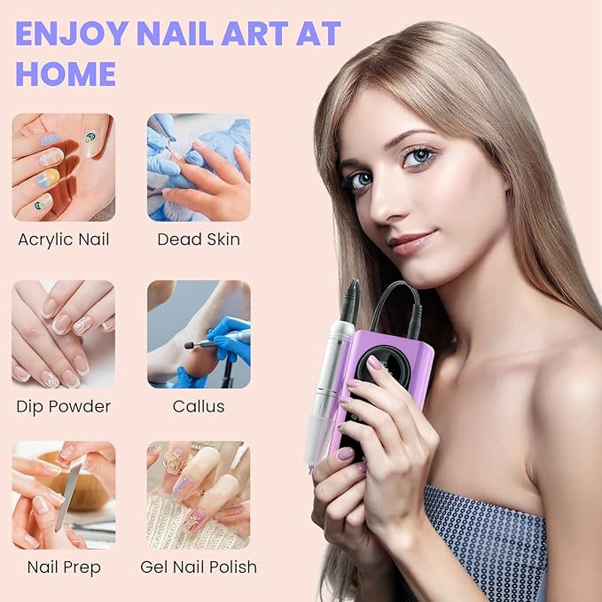 - 45000 RPM High tech Acrylic Nail Drill: This high-tech nail drill is designed for beginners and professionals to remove the thick acrylic nails within 2 minutes. Low vibration, low noise, low heat dissipation. The powerful 3600mAh battery can last for 7-8 hours. It has 13 salon drill bits, 2 filers and 1 brush to provide a fast and professional nail care journey