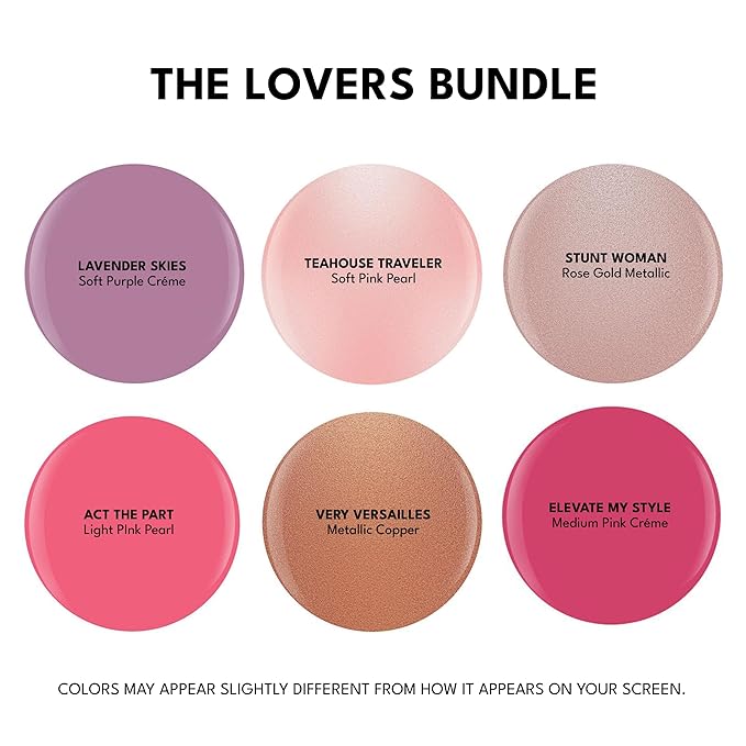 - Lovers Pack includes 6 bottles of Fortify & Protect Colors: Lavender Skies (Soft Purple Creme), Teahouse Traveler (Soft Pink Pearl), Stunt Woman (Rose Gold Metallic), Act The Part (Light Pink Pearl), Very Versailles (Metallic Copper), and Elevate My Style (Medium Pink Creme).