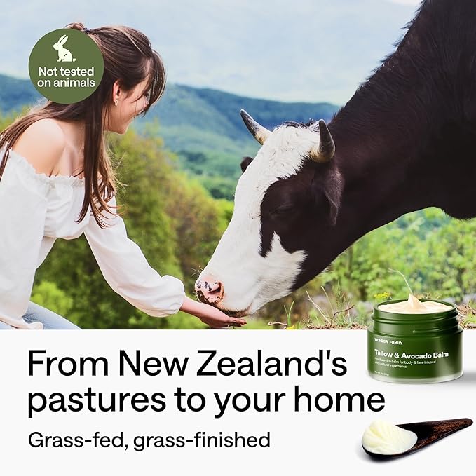 - Grass Fed Beef Tallow Skin Care: our facial beef tallow is sourced from grass fed tallow cows of New Zealand; animals are not slaughtered specifically to make beef tallow body lotion, as our beeftallow for face comes only as a by-product