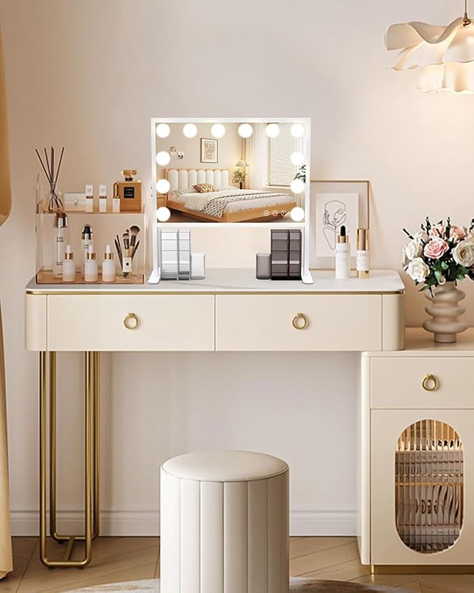 - Multi-functional Makeup Experience: A USB charging port on the right side of the Hollywood mirror makes it easy to charge your phone or other electronic devices, and it comes with a phone holder and two makeup storage. This design combines lighting, charging, viewing, and storage functions to make your makeup process more efficient and enjoyable.