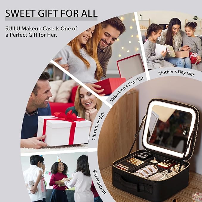 - 【ideal perfect gift】SUILU makeup bag with led mirror is the perfect gift for your wife, girl friend, mother, makeup lovers in any special days, such as mother's day, birthdays, valentine's day, halloween, anniversaries, christmas and more.it is not only storage your cosmetics, but also jewelry, electronic accessories, camera, essential oil, toiletries, shaving kit, valuable objects and so on.a must-have for your travels.