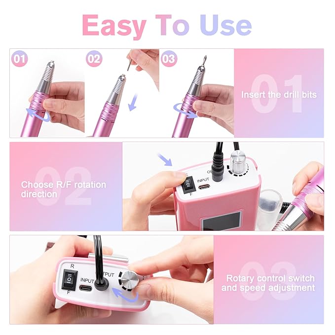 - VERSATILE NAIL DRILL EXPERIENCE: Cordless nail drill kit equipped with 11 interchangeable drill bits and 50 sanding bands for various purposes, fulfilling all your nail care needs. Perfect for removing gel nail polish, prepping nails, dip powder nails, acrylic nails, thick nails, pedicures, cuticles, or dead skin. Ideal for polishing, shaping, buffing, grinding, and other nail art necessities.