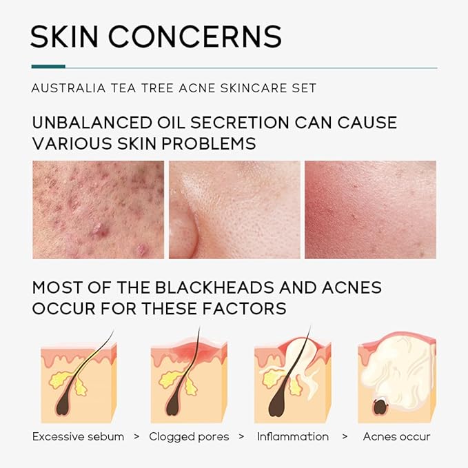 - 【Tea Tree Oil Acne Treatment Skin Care Kit】——Facial acne treatment kit contains a lot of tea tree essential oil,which can unclog pores and improve acne and blackhead-prone skin caused by blocked pores. Our Skincare Gift Set penetrates deep into the buttom of skin to continuously hydrate the skin for a long-lasting moisturising skincare effect, effectively controlling oil