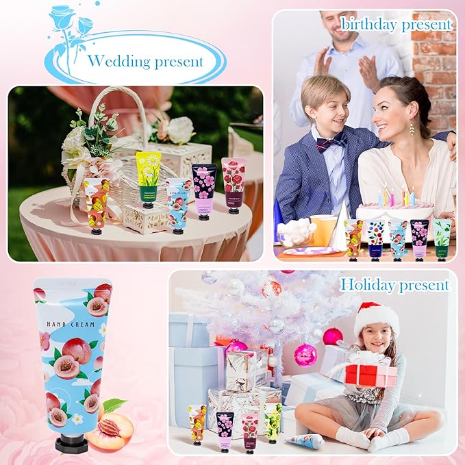 - Hand Cream Present Set: mini hand cream is very suitable as a present for Mother's Day, Birthday, Teacher's Thanks, Christmas, Coworkers, Stocking stuffers, Thanksgiving, Baby shower, Bridesmaid, Wedding, Valentine's Day and adult party