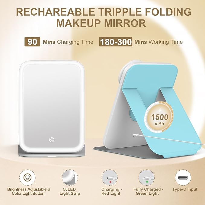 - 🔋【Mocado Rechargeable Travel Makeup Mirror】Equipped with 800mAh battery, only need 120mins to charge it can be used for 3-7 hours, fully meet the make-up needs for 7 days travelling. Equipped with 0.5m TypeC charging cable, you can charge it via laptop, mobile power supply, charger,etc. Indicator light flashes red when charging, turns green when charging is complete.