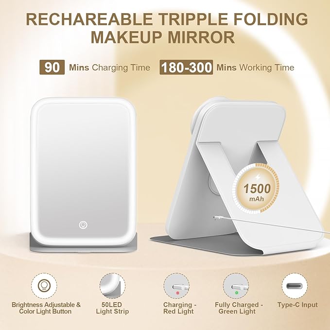 - 🔋【Mocado Rechargeable Travel Makeup Mirror】Equipped with 800mAh battery, only need 120mins to charge it can be used for 3-7 hours, fully meet the make-up needs for 7 days travelling. Equipped with 0.5m TypeC charging cable, you can charge it via laptop, mobile power supply, charger,etc. Indicator light flashes red when charging, turns green when charging is complete.
