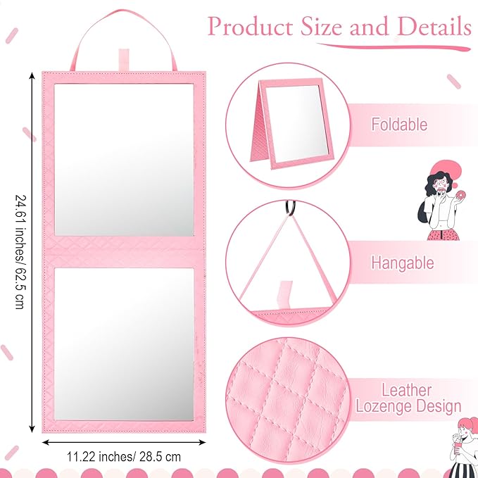 Foldable Backstage Mirror with Handle 24.61x 11.22 Inch Leather Folding Hanging Mirror Rectangular for Travel Dance Bag Home Fitness Spa Gift for Dancers(Pink)