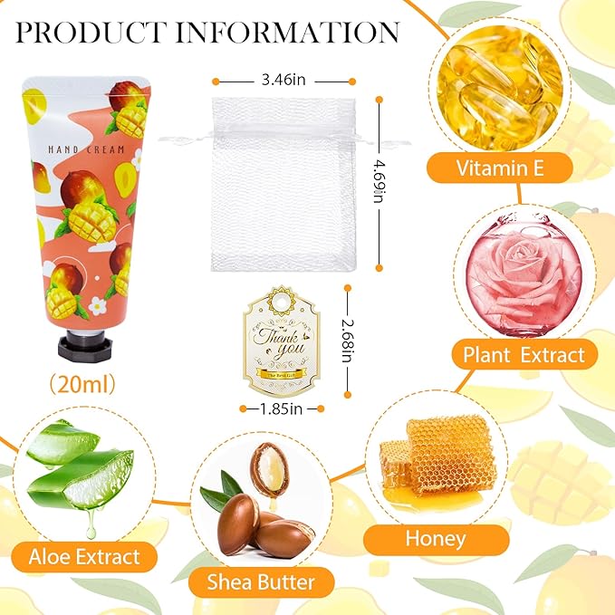 - 96 Pack Hand Cream Set: 12 different flavors include peaches, avocado, grapes, cherries, mangoes, grapefruits, chamomile, gardenia, roses, cherry blossoms, green tea, blueberries, 8 for each flavor, There are also 60 organza bags and 60 thank-you tags, You can choose the right taste in different scenes and moods, Share with loved ones