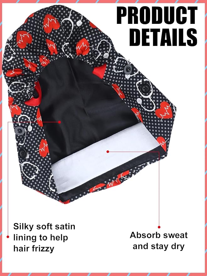 - Truly Outstanding Quality: crafted from a blend of cotton and satin cloth, our nurse scrub caps flaunt notch quality! The cotton layer keeps the cap breathable while the satin lining aids in well sweat absorption; Enjoy a grease free hair experience with this lightweight cap, offering comfort without adding any more weight to your head
