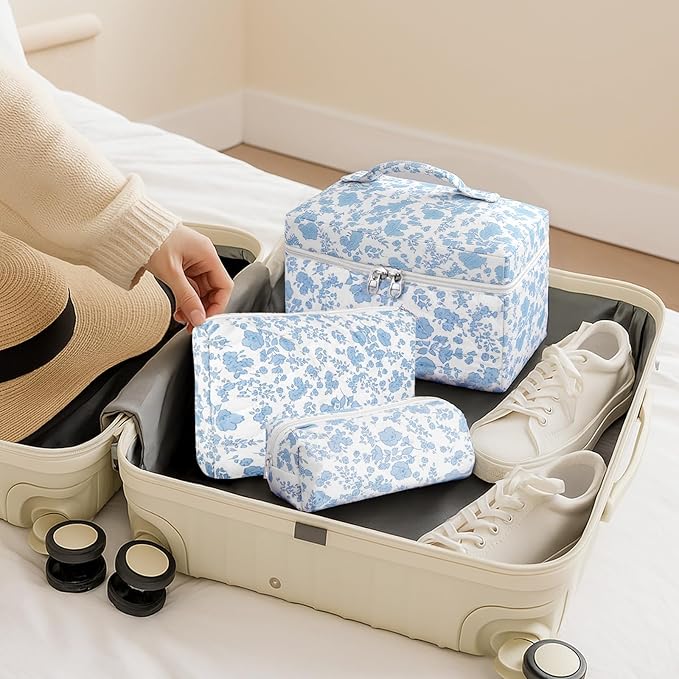 3Pcs Cotton Quilted Makeup Bag for Women Girls, Large Floral Cosmetic Bag Set Cute Makeup Brushes Aesthetic Accessories Storage Bag Travel Toiletry Bag Organizer, Little Flower Blue