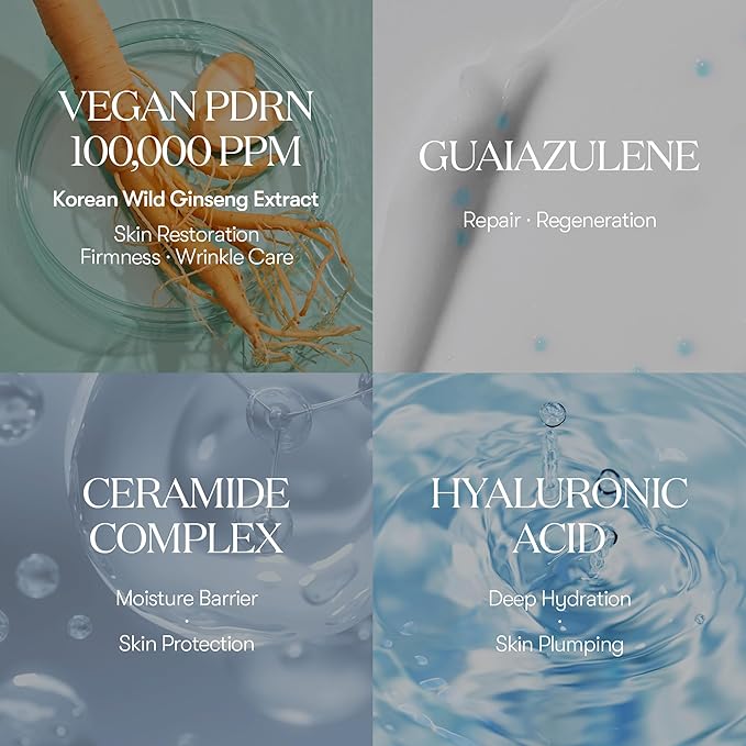 - [VEGAN 100,000 PPM PDRN] Our vegan PDRN is sourced from Korean wild ginseng, offering a superior plant-based alternative to commonly used fish-derived PDRN. With a lower molecular weight and enhanced stability, it delivers 5.5 times the absorption rate of Salmon PDRN, ensuring maximum efficacy.