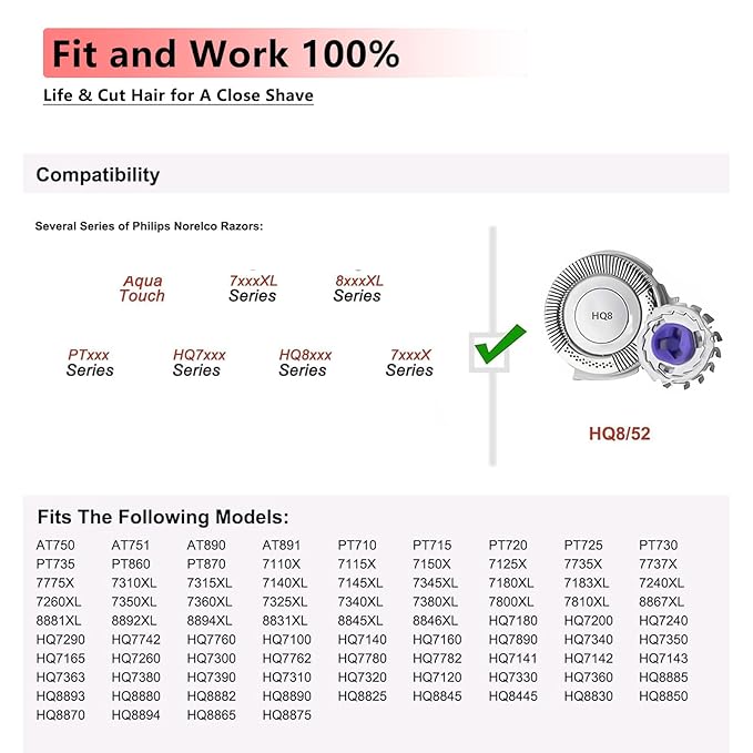 - [compatibility]: Blades for philips norelco hq8 aquatec replacement blades,Compatible with hq8 Shavers Models: AT750 AT751 AT890 AT891 PT710 PT715 PT720 PT725 PT730 PT735 PT860 PT870, HQ71XX series, HQ73XX series, HQ88XX series.