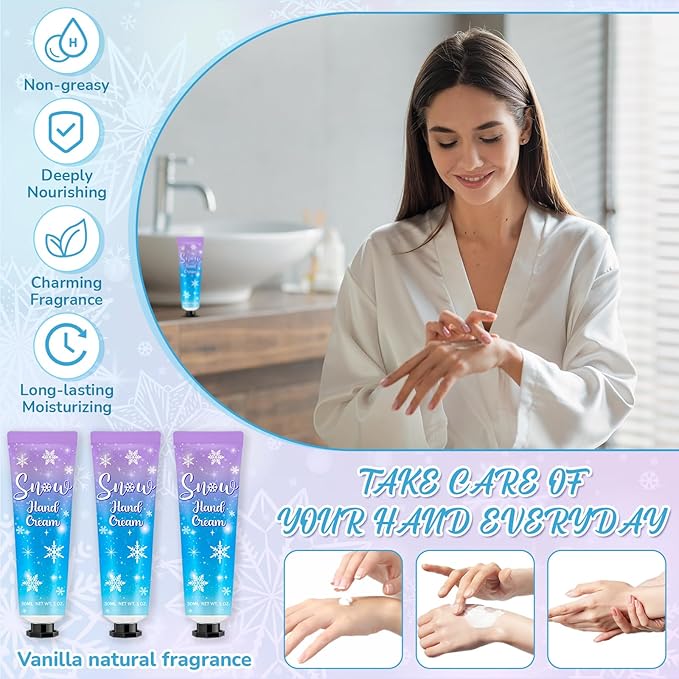 - Hand Cream Gift Set: you will receive 48 pieces of winter snowflakes hand cream gift sets, includes 48 pieces of hand cream and 48 pieces of gift bags, the hand cream comes in vanilla scents; Abundant quantity is enough for your daily use and replacement, and you can share them with your family, friends, colleagues