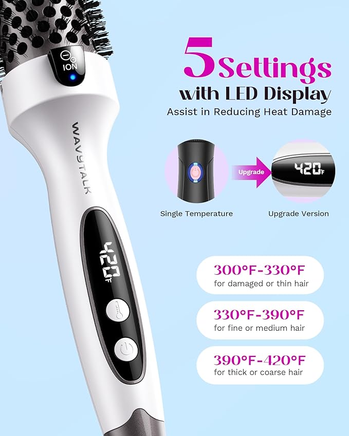 - 5 Temperature Settings & LED Digital Display: Wavytalk thermal round brush offers multiple temperature options, allowing better control during styling to achieve optimal results while minimizing heat damage. 300℉/330℉ for thin or damaged hair; 360℉ for normal hair; 390℉/420℉ for thick or coarse hair.