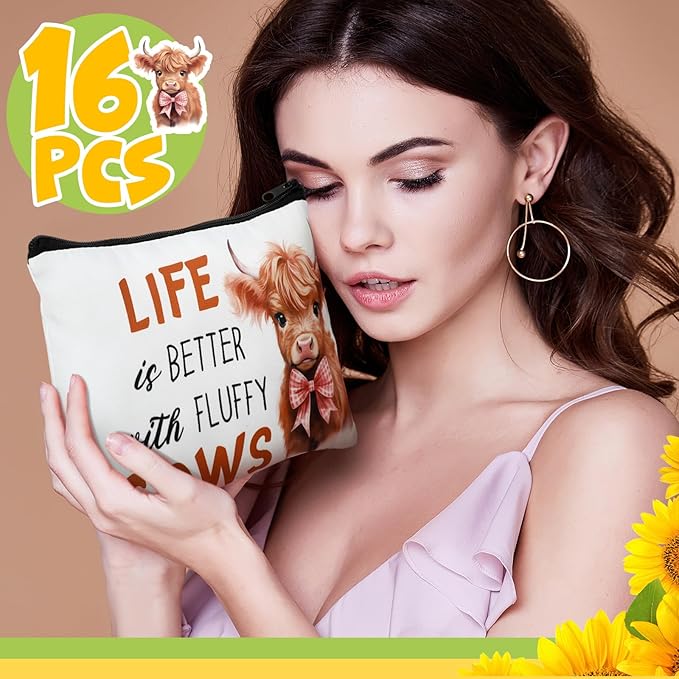 Pinkunn 16 Pcs Canvas Cosmetic Bag Bulk Inspirational Quotes Makeup Bags with Zipper Encouragement Travel Toiletry Pouch Appreciation Gift for Christmas Teacher Birthday Graduation(Highland Cow)