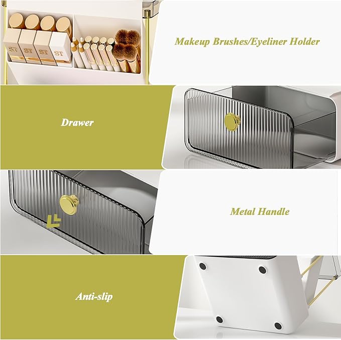 - Countertop Organizer and Storage: The total height of this makeup organizer is 8.86 inches. The bottom drawer is 8.86in long, 7.68in wide and 3.9in high.This cute cosmetic organizer is compact and does not take up much space, but has enough space to organize most makeup or small office supplies.