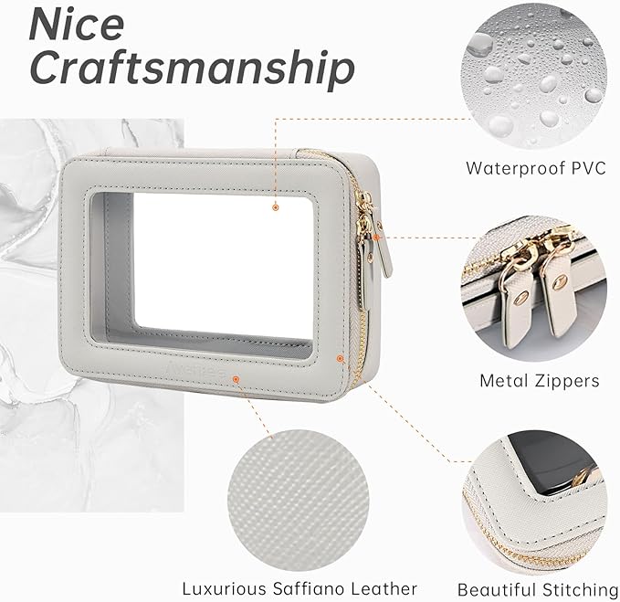 - LUXURY DESIGN: Measuring 7.9” x 5.7” x 2.7”(20 cm x14.5cm x 7cm), our clear makeup bag is leek and stylish, this makeup travel organizer was designed in a minimalist boxy shape and an elegant pearl blue color. Crafted in beautiful PU leather and finished with polished hardware, it's the clear pouch you'd be happy with sitting out on display beside you.