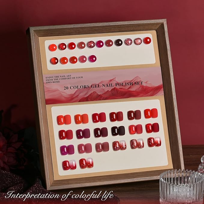 - Package Includes: 20 gel polish colors of 0.22 fl.oz (6.5ml) each + glossy & matte top coat + base coat. Basic gel nail kit to enjoy the nail art from the comfort of your own home