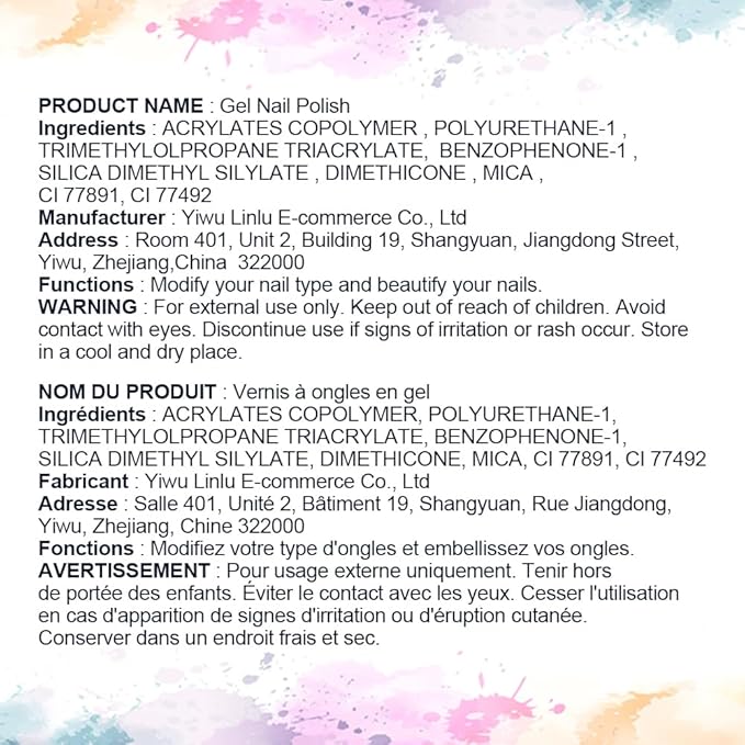 - 【Warning】Please avoid contact with eyes, mouth and skin. It is only used for fingernails. When the gel polish contacts them, please wash it immediately. In case of redness and itching, please stop using the product. Keep out of the reach of children.