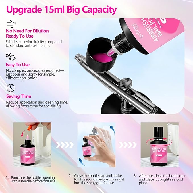 - [READY TO USE, NO DILUTION REQUIRED] Our beginner-friendly, WATER-BASED FORMULA enhances fluidity for smooth and effortless application. With QUEVINA airbrush gel nail polish, there’s no need for dilution or extra water, allowing for seamless spraying without any clogging. Perfect for both novices and seasoned nail artists alike.