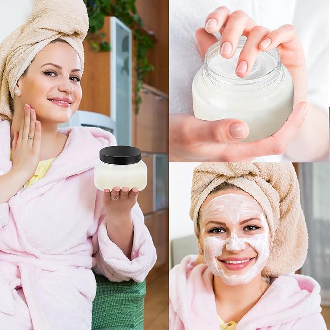 - [Widely Used]:This cosmetic bottle with lid is very versatile, excellent storage jars for creams, emulsions, body scrubs, body butter, and other personal care, and is also suitable for storing items such as dry food, nuts, spices, flour, cute candy, or other handcrafted items.It is not recommended to install higher temperature objects.
