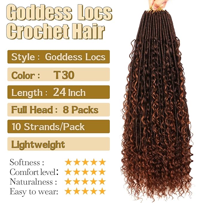 - 4.Features:Pre-looped Goddess locs crochet hair, very easy to install, friendly to beginners. Light weigh, suitable for daily wear.Unique look, looks beautiful when you wear it
