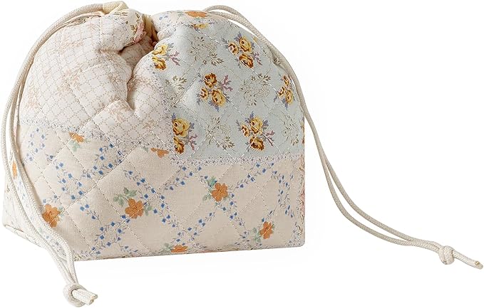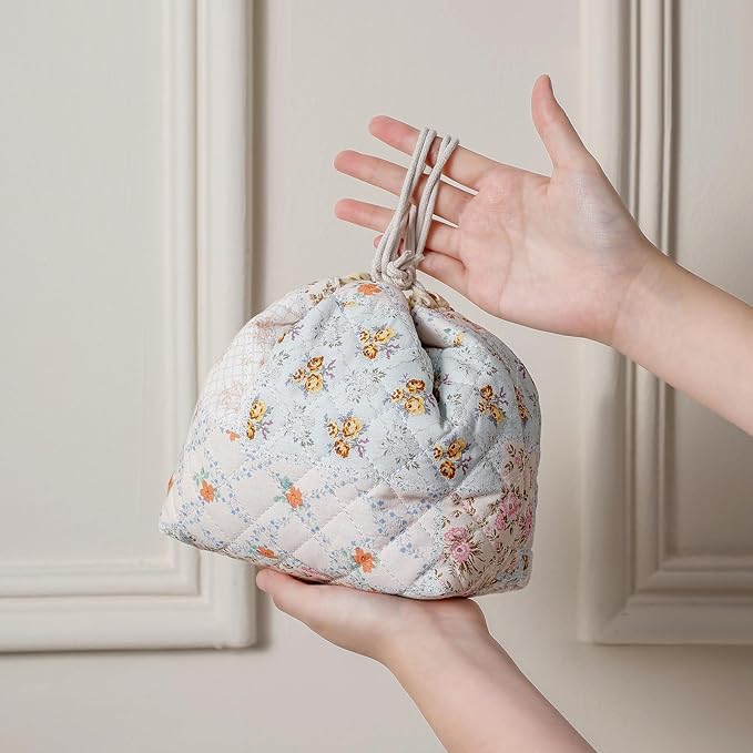 Cotton Quilted Drawstring Makeup Bag with Canvas Lining,Coquette Aesthetic Cute Travel Toiletry Bag,Drawstring Gift Bag for Women and Girls(08Pink Flower)