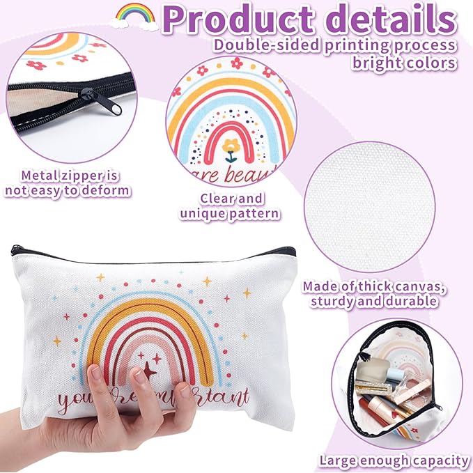 - 【Rainbow Print】Rainbow makeup bags are printed in 8 different styles, 2 of each. 16pcs rainbow canvas makeup bags are enough for you to use and change, and the different prints help you differentiate between different uses