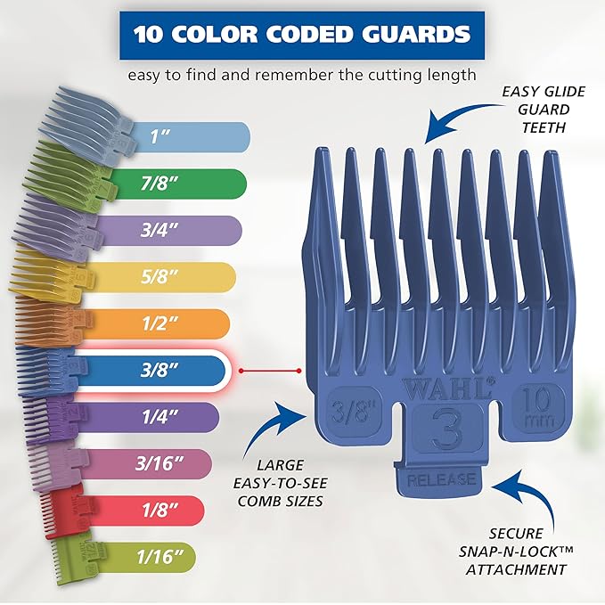 - Easy Match Color Code – 10 Color coded haircutting attachment guards and clipper color key make it easy to find and remember cutting lengths. Corresponding the correct colored comb to the right cutting length (1/16”– 1”) is simple with our easy-to-use clipper key.