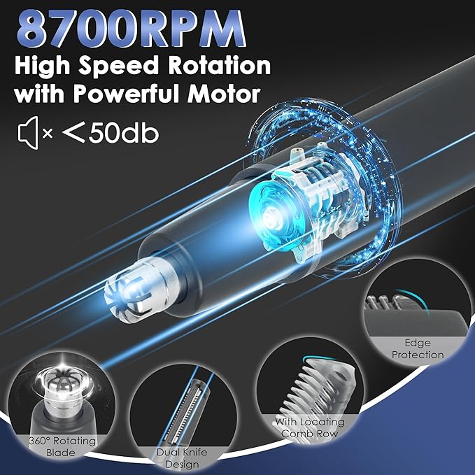 - 【Great Mens Groomers 】 Electric nose hair trimmer with High-quality double-edged blades and inner 360° rotating design for precise removal of unwanted hairs, high-speed rotation with powerful motor - 8700 rpm for high-speed rotary shaving, easy to deal with thick beards, more thorough shaving without pain or unpleasant tugging sensations(Just one electric trimmer)