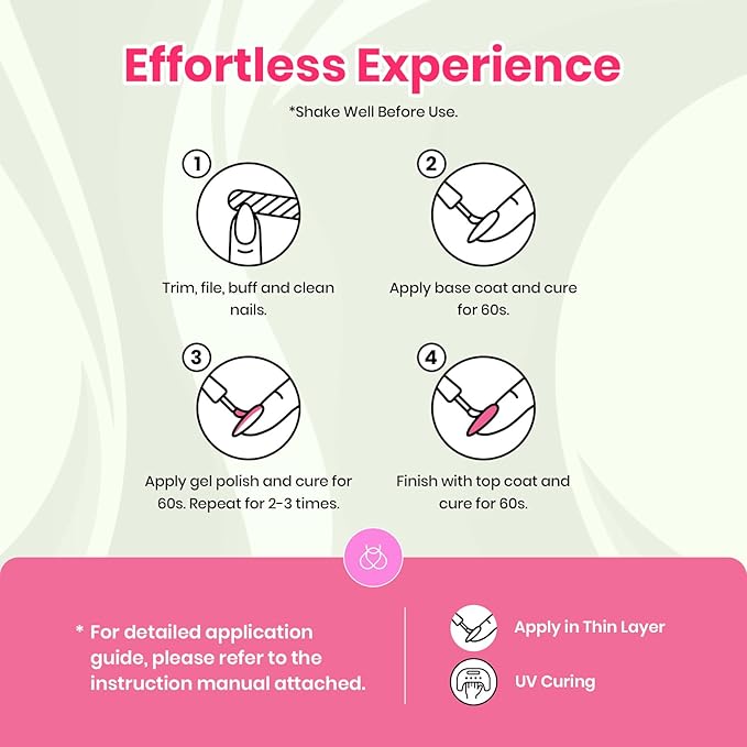 - Beginner-friendly: The gel polish is very smooth and the colors are vibrant. Even beginners can achieve an even application. With proper application, the polish won't easily chip and can last for over 4 weeks. Please refer to the instruction manual for detailed application steps.