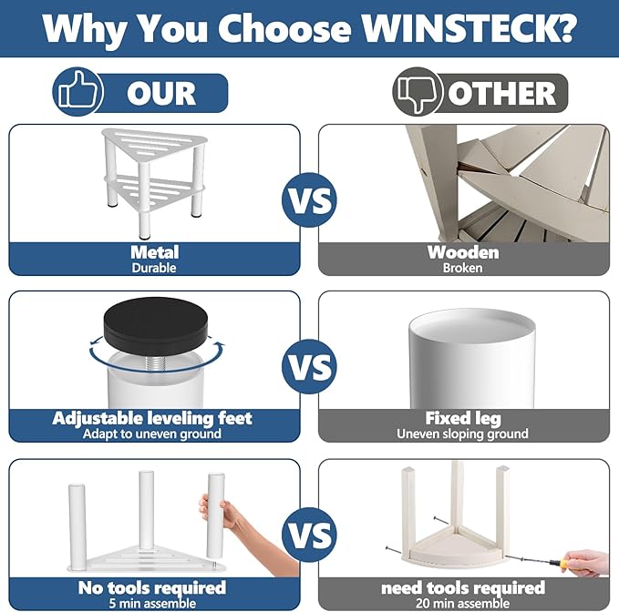 - 【Metal Material】WINSTECK shower foot stool is made of metal with a white matte finish that won't oxidized. New upgrade to improve stability and won't bend. It is sturdy and can bear a maximum weight of 400Lbs. The installation is simple and fast, no tools are required, and it takes about 5 minutes to complete. This is ideal for bathrooms.