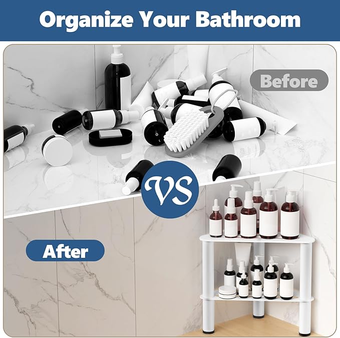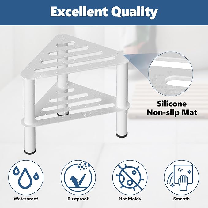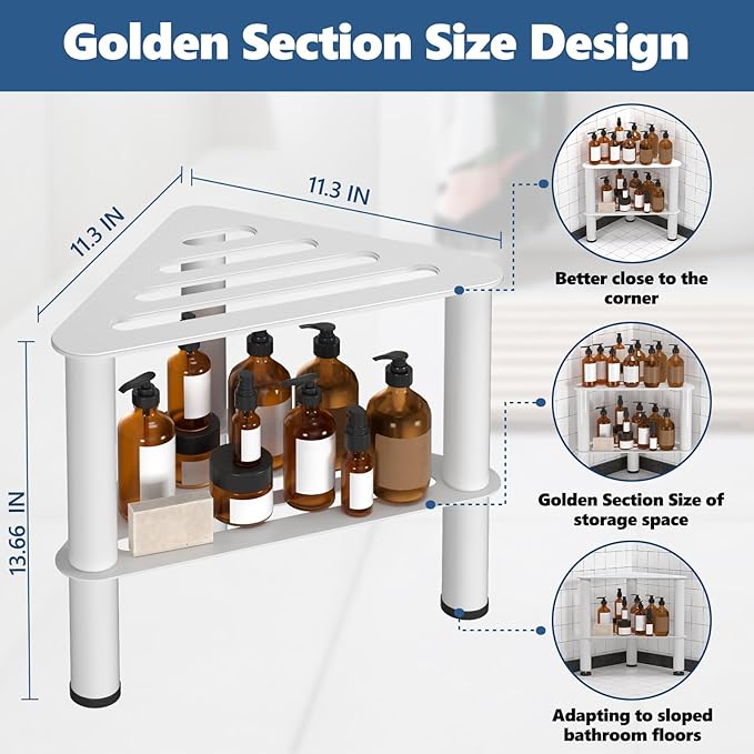 - 【Great Design】 The shower foot stool top shelf is a non-slip surface that is safe to place your feet on it and shaving legs without risk of slipping. There are also drainage holes on the shelf, so you don’t have to worry about water accumulation. The design of adjustable foot pads can better adapt to the sloped bathroom floor, you can adjust the level according to the situation. And there are also anti-slip pads on the feet. It fits perfectly in a corner and doesn't take up much space.