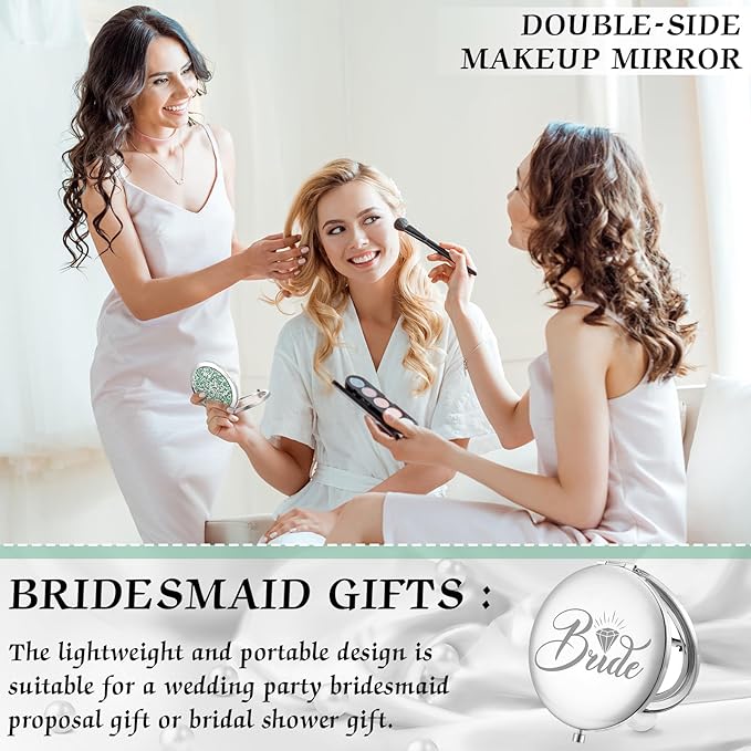 - Exquisite Styles: showcasing an exquisite style, the front of each compact mirror is inlaid with small, shining rhinestones, creating an elegant shine; Moreover, the back is engraved with [Bride] and [I Do Crew] words, adding attractiveness and charm to these beautiful accessories
