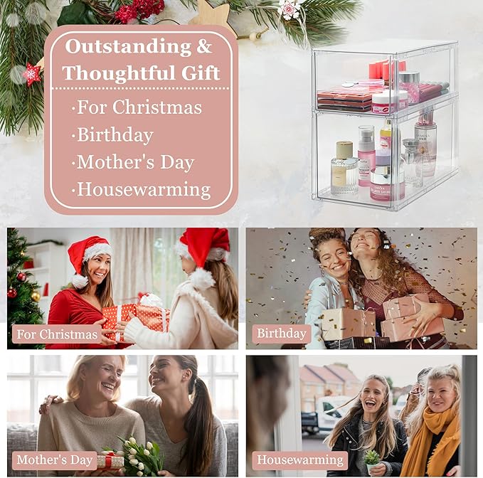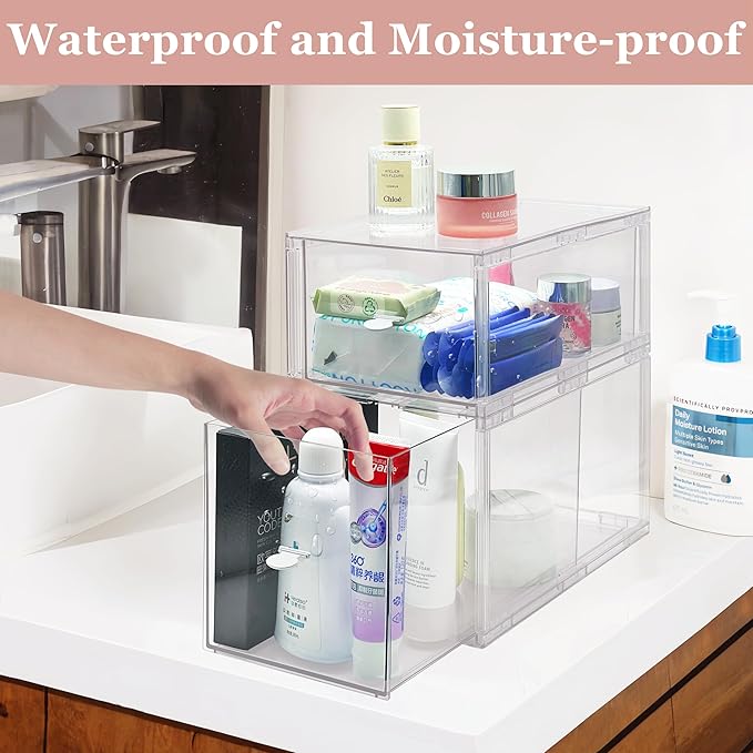 - Maximize Countertop Space with Vertical Design: Our stackable makeup organizer featuring 2 storage drawers, included large 11.7" D and 4.5"H & 6.5"H storage containers.This vertical storage solution is designed to save precious countertop space while neatly organizing your items in the acrylic drawers