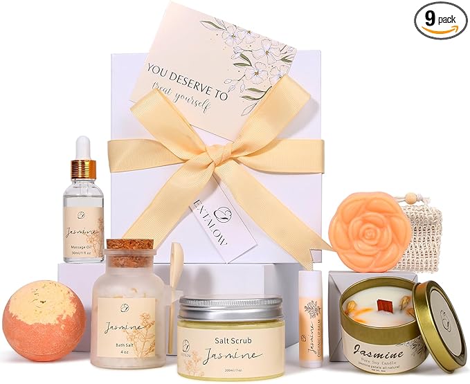 - Handcrafted Spa Gifts for Women: EXTALOW Jasmine Spa Gift Box has everything a woman needs! It includes Jasmine Body Scrub, Scent Flower Shaped Soap Bar, Soap Bag, Bath Salt Ball, Bath Salts, Massage Oil, Lip Balm, Candle, and a Gift Card. Packed in an Elegant Gift Box with Bow.
