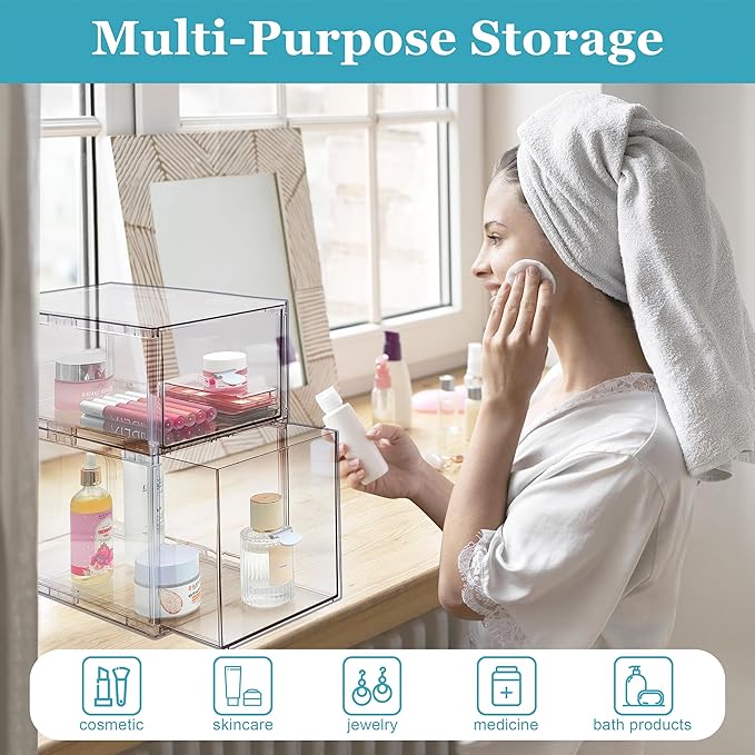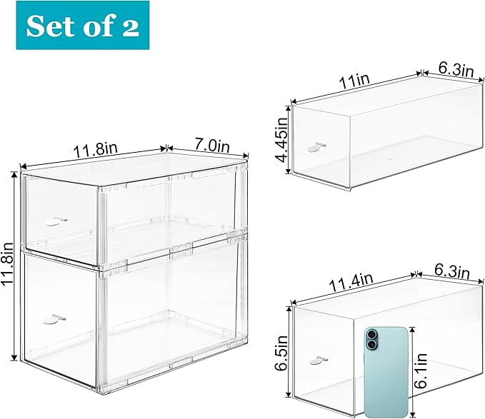 Stackable Storage Drawers Set of 2, Clear Makeup Organizer for Vanity, Acrylic Cosmetic Display Cases, Large Capacity Makeup Organizer Countertop, Undersink, Kitchen Organization and Storage