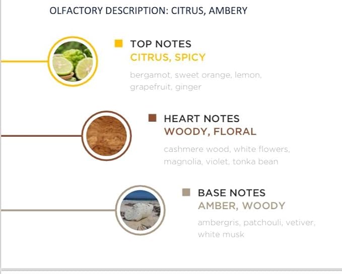 - Top Notes: Bergamot, Sweet Orange, Lemon, Grapefruit, Ginger (Citrus, Spicy) Heart Notes: Cashmere Wood, Magnolia, Violet, Tonka Bean (Woody, Floral) Base Notes: Ambergris, Patchouli, Vetiver, White Musk (Amber, Woody)