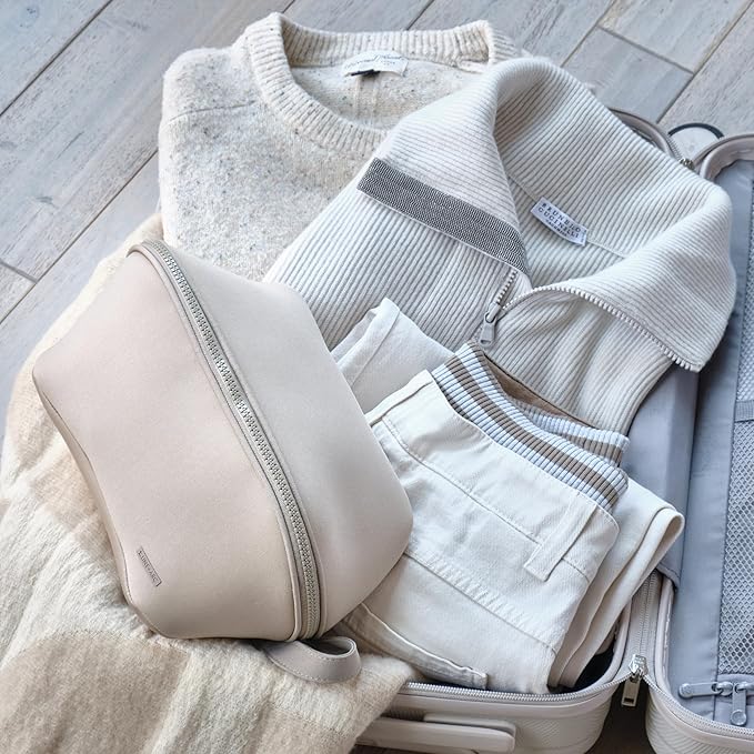 LINE+ARC Machine-Washable Neoprene Toiletry Bag (Sandstone) Modern Taupe Beige Dopp Kit Soft Insulation Cosmetics Makeup Travel Skincare Shaving Large Case Men Women Overnight Easy-to-Clean