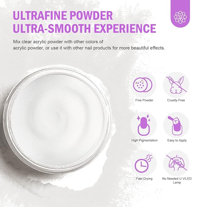 - MULTIFUNCTION CLEAR ACRYLIC POWDER: The clear acrylic powder is a bubble-free polymer with extraordinary transparency, different from other colored acrylic powders, it can not only do nail extension, nail carving, nail repair, adhesive decoration, but also well connect and repair with other colors, helping to create more beautiful and natural acrylic nails. You can mix clear acrylic powder with other colors of acrylic powder, or use it with other nail products for more beautiful effects.
