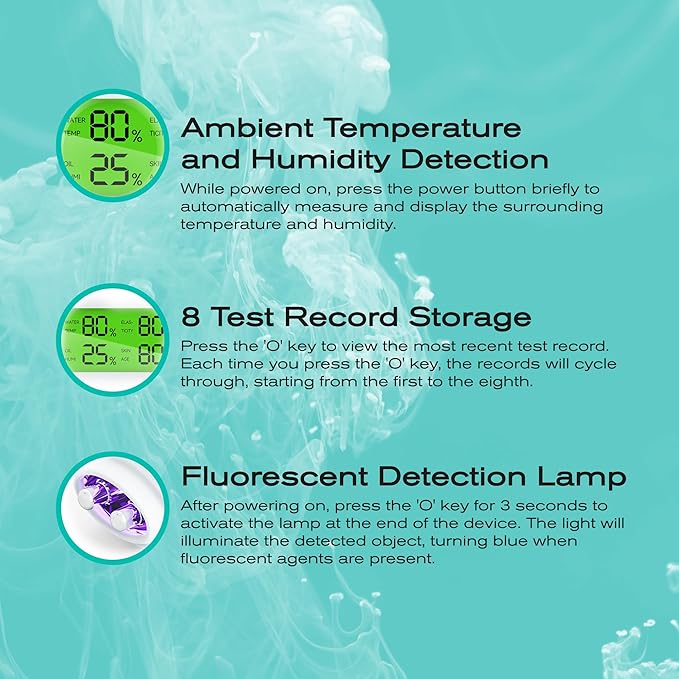 - Features Fluorescent Agent Detection Capability: The EpixCare Skin Hydration Monitor is equipped with advanced fluorescent agent detection capabilities, allowing it to identify the presence of fluorescent agents commonly found in skincare products. This functionality helps you make informed decisions about the safety and quality of the products you use.