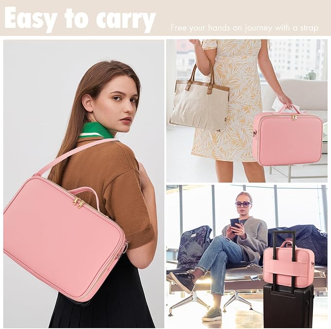 - 【Extra Larger Capacity】Size:15in x 11in x 5.5in--Bring all your beauty essentials and cosmetics wherever you go with this large travel makeup bag. Featuring a handle, removable shoulder strap and luggage sleeve for easy transportation. Just right for professional makeup artist or makeup amateur.