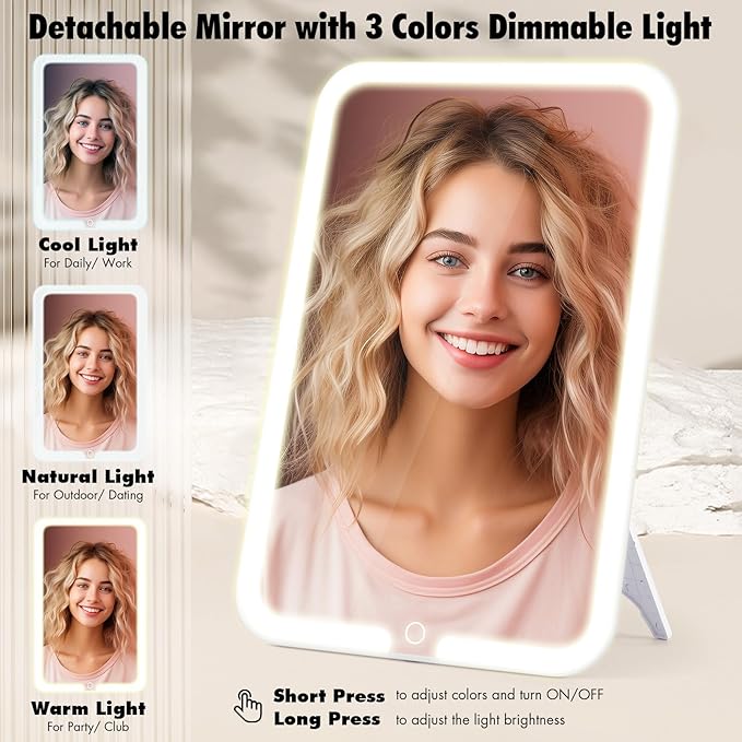 - 【Professional 3 Color Fill Lights】The full-screen 4K makeup mirror has 3 COLOR SETTINGS with ADJUSTABLE BRIGHTNESS. Long press the switch to adjust light brightness from 10% to 100%, gently touch the switch to adjust color temperature between cold, natural, and warm light to ensure you always have the perfect makeup whether the sophisticated party makeup, commuting makeup, or daily makeup.