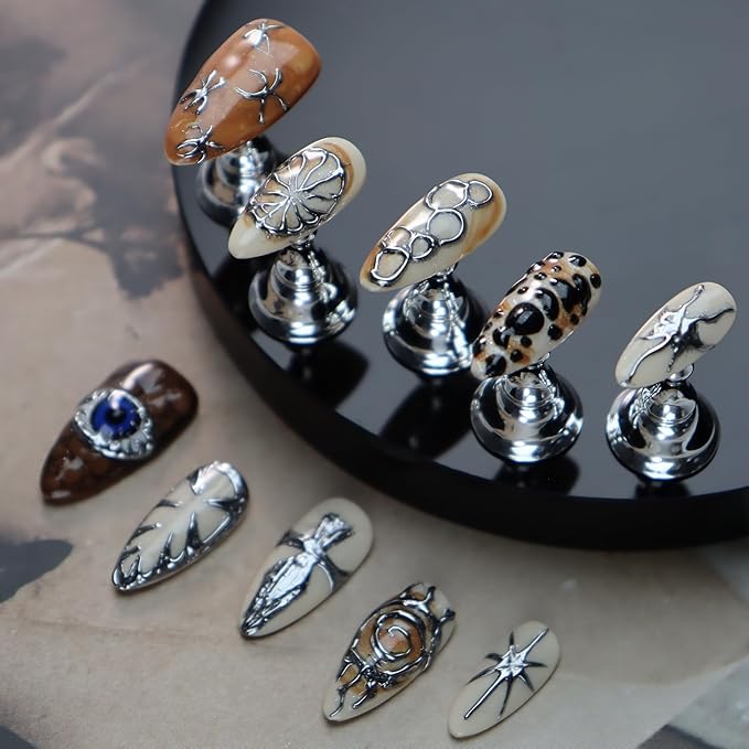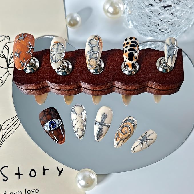 - DESIGN: Our stick on nails are all handmade by experienced and aesthetic nail artists. The press ons have hand-painted swan/floral/polka dots/french tip/snowflake/plaid/bowknot ribbon/holiday tree/blue eye/silver patterns on them, and with 3D flower/mermaid/mushroom designs/rhinestone/pearls trim, glitter and sparkle cat eye/metallic surface, luxury, exquisite and unique