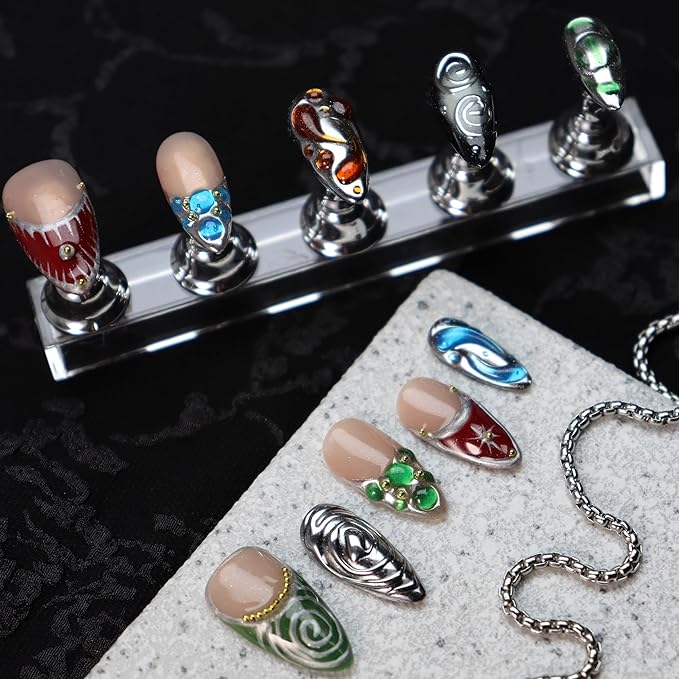 - DESIGN: Our stick on nails are all handmade by experienced and aesthetic nail artists. The press ons have hand-painted swan/floral/polka dots/french tip/snowflake/plaid/bowknot ribbon/holiday tree/blue eye/silver patterns on them, and with 3D flower/mermaid/mushroom designs/rhinestone/pearls trim, glitter and sparkle cat eye/metallic surface, luxury, exquisite and unique