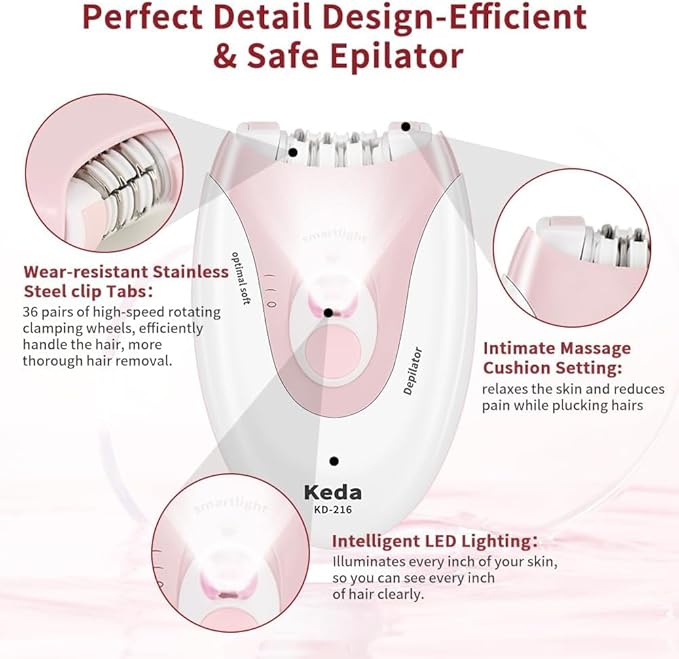 - Rechargeable and Ergonomic Design: The epilator for women has a built-in high-capacity battery that provides ample power for multiple sessions on a single charge, giving you the flexibility to use the epilator anytime and anywhere. Our epilator boasts an ergonomic design that fits comfortably in your hand. The lightweight and compact construction makes it easy to handle and control, allowing for precise hair removal even in hard-to-reach areas.