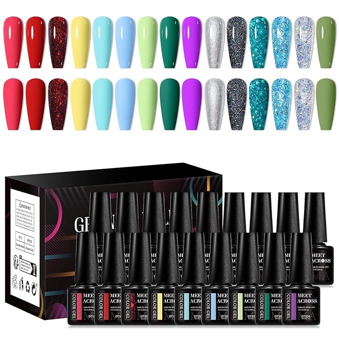MEET ACROSS Gel Nail Polish Set 18PCS Glitter Gel Polish Set 15 Colors Nude Nail Polish Red Green Spring Gel Nail Polish Kit Nail Art Design Salon for Women