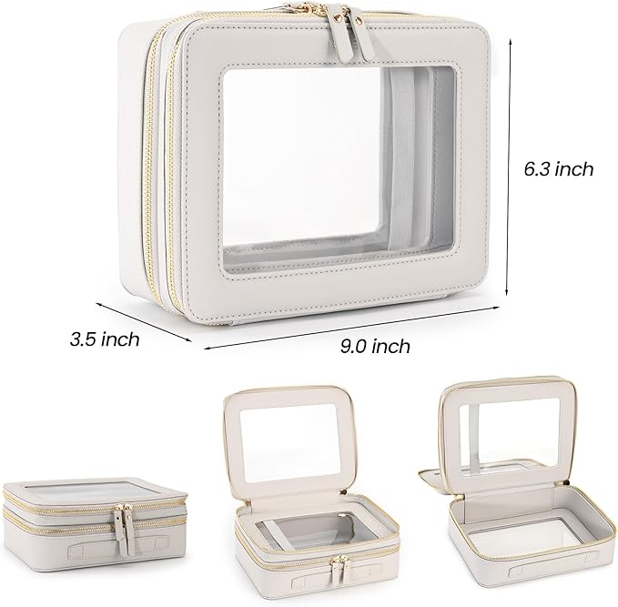 - ❤【DOUBLE SIDED DESIGN】Measuring 9.4’’ x 7.1‘’ x 3.9”(24cm x18cm x 9.9cm), our makeup bag adopts a thoughtful double layer design. The upper layer is designed slightly smaller, serves as a neat makeup brush holder organizer. The larger lower layer offers ample space for storing cosmetics and toiletries. A versatile clear cosmetic bag for travel, a handy toiletry companion for the car center console, and a stylish organizer for your bathroom essentials.